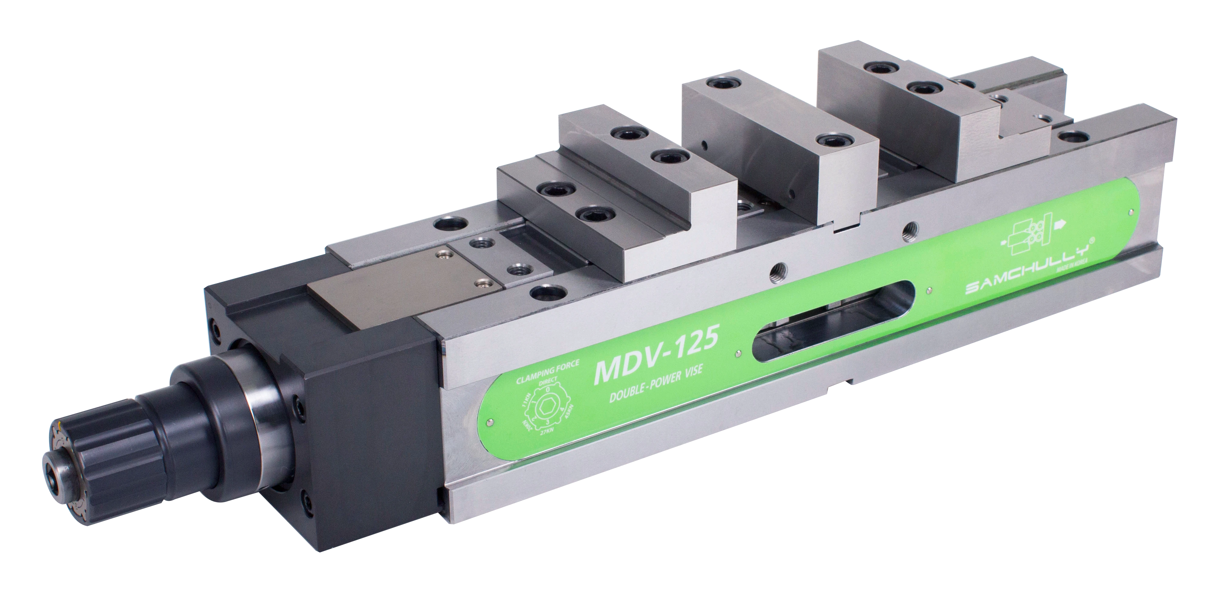 Samchully will feature the MDV-125 power vise is a dual station vise using two moving outside jaws and a fixed center jaw for double clamping. A mechanical multiplier booster system (Power Vise) provides high clamping force with low input force when turning the handle. The Samchully Power Vise series uses a mechanical booster system to take the place of a torque wrench at the input handle. The predetermined torque settings on the knob at the input key, allow different clamping force settings at the clamping jaws. The maximum clamping force for the MDV Power Vise is 4,355 kg (9,581 lbs), with the preset dial allowing 4 clamping force steps to reach this maximum.