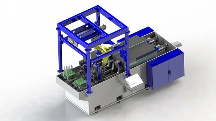 The new Nagel/TBT DM 50 with integral robot is specifically designed to automating low-volume, high-mix production requirements. With robot overhanging from a bridge on top, machine uses very little additional floor space. Finished tray can be removed and green tray loaded when the machine is running to improve productivity. The machine can be run in manual mode only bypassing the robot altogether for very low volume applications.