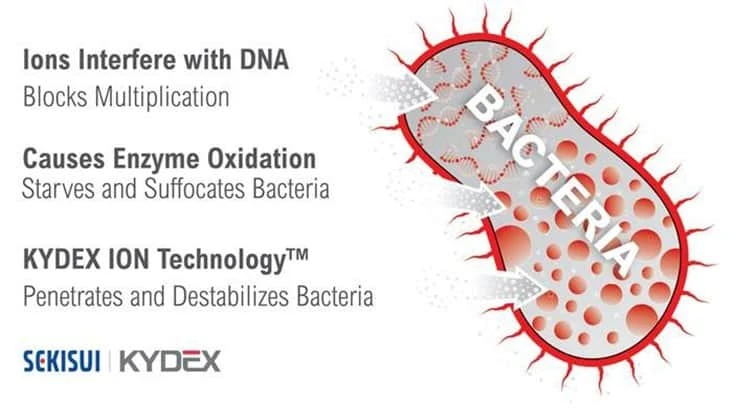 KYDEX ION Technology is 99% effective at inhibiting the growth of stain- and odor-causing bacteria on KYDEX Thermoplastics.?KYDEX ION Technology interferes with bacteria?DNA, which prevents stain- and odor-causing bacteria from multiplying on the treated thermoplastic sheet.