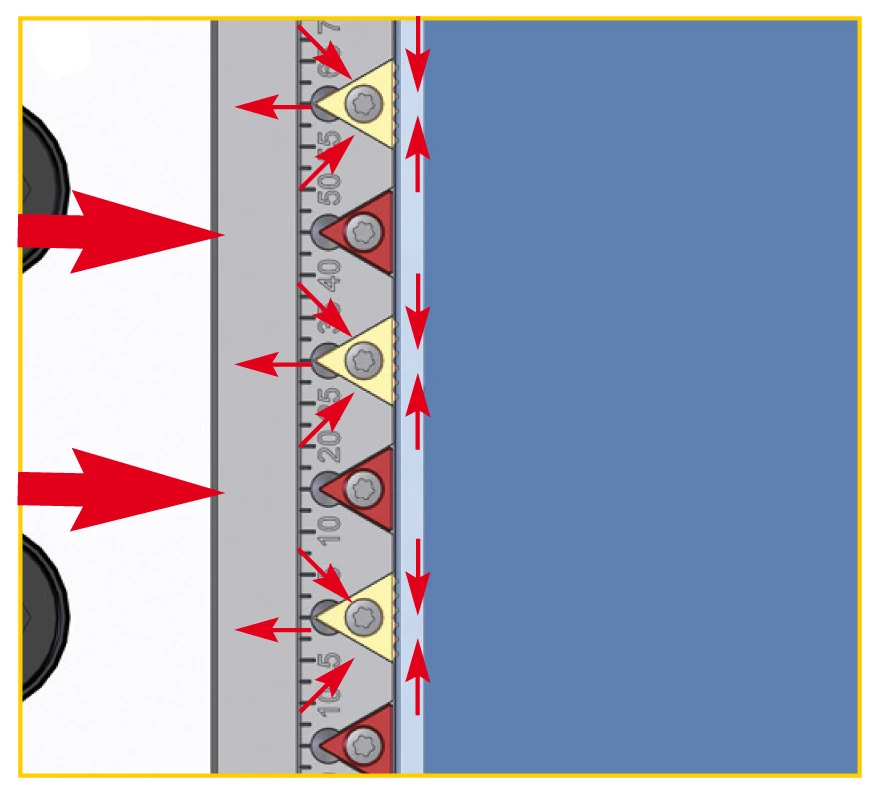 Developed primarily for use with OML's MC and Genius vises, SinterGrip jaws use scientifically designed, serrated, carbide inserts to penetrate the workpiece edge to a minimal, controlled depth and exert a push-down force on the part. Thin parts can be machined without deformation by clamping them at 6,600 pounds force to achieve penetration, then lowering the force to 2,200 pounds with no loss of gripping power. The jaws can also grip equally well on as little as 2 mm of part surface if the application requires.