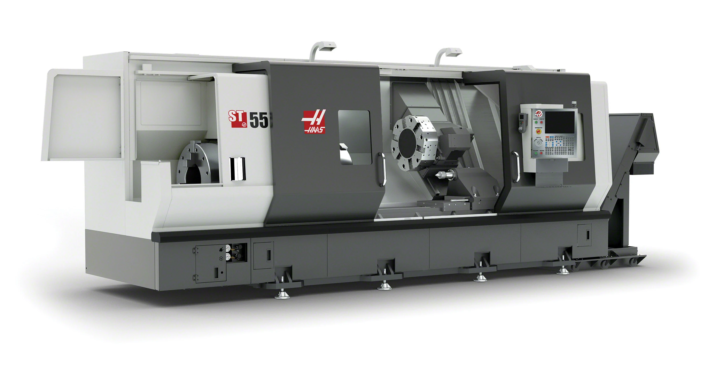 The ST-55 from Haas Automation, Inc., is a heavy-duty, large-bore turning center that is extremely rigid, highly accurate, and very thermally stable. The machine’s twin-chuck capability, high-torque spindle, and 12.5" (318 mm) diameter through-bore make it ideal for machining heavy pipes and fittings, large couplers, and long rollers. It has a maximum cutting capacity of 25.5" x 80" (648 x 2032 mm), with swings of 34.5" (876 mm) over the front apron and 25.5" (648 mm) over the cross slide. A servo-driven tailstock (MT5 taper) is standard, and a steady rest provision is available for additional support of long shafts.
