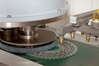 As the magnetized belt grips the parts in their carrier, they are presented to the planetary head, where three 10-inch abrasive filament disc brushes deburr the upward facing surface. Edge break, surface finish and material removal are accurately controlled. In this system, the parts are then rinsed as they pass under a coolant shower, and then dried by an air knife before traveling over a demagnetizer.  A system that deburrs both sides of the parts in a single pass is also available from Abtex.