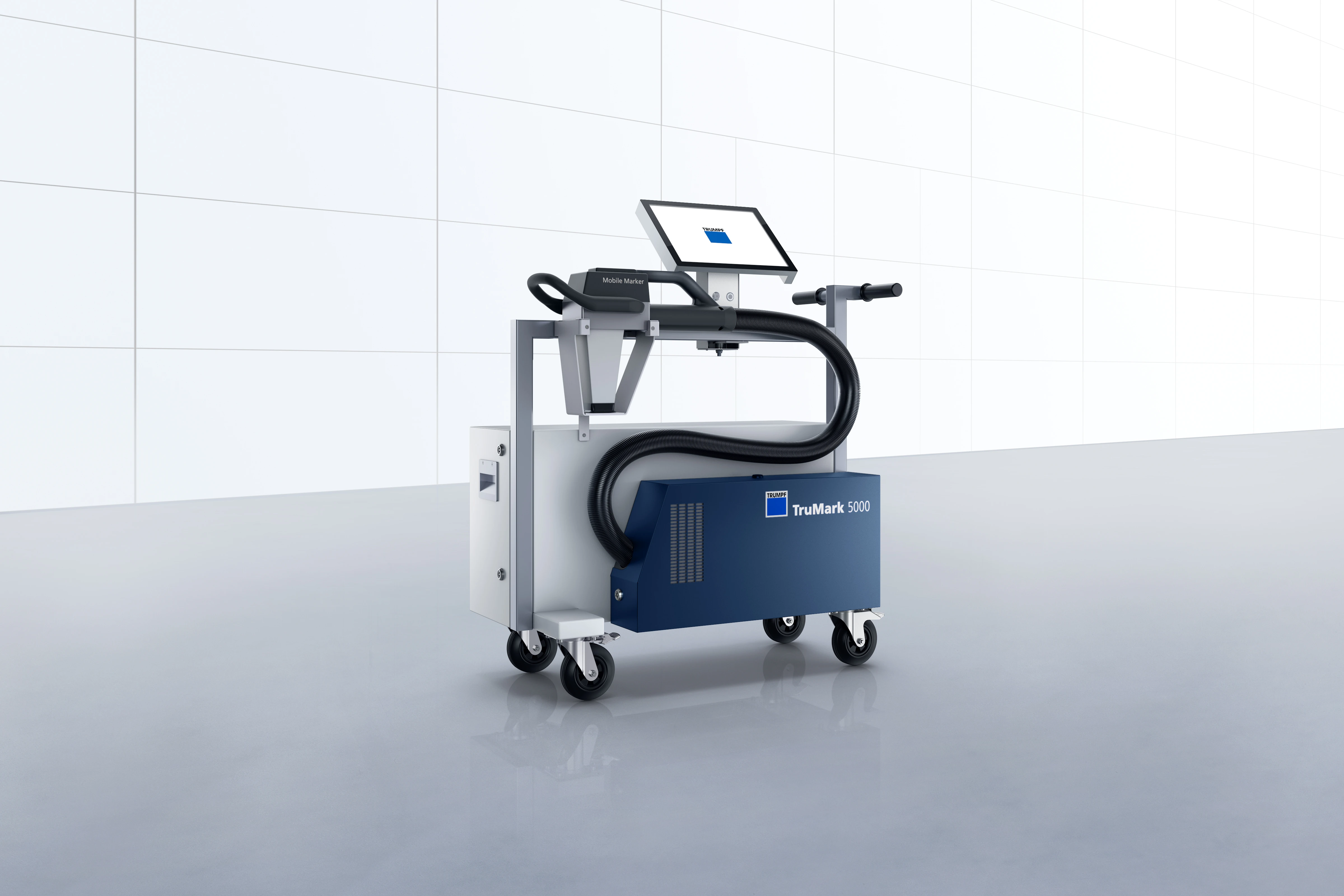 A fiber laser operating in the infrared spectrum forms the heart of the TruMark 5010. A laser light cable guides the beam from a mobile frame which holds the laser, safety controls and suction system, to the scanner unit at the workpiece. When the operator positions the TruMark 5010 Mobile Marker, a vacuum is created which hermetically seals any gap between the machine and the component. If the processing head is not properly positioned, sensors prevent the laser from emitting its beam. This guarantees that the operator cannot inadvertently start the laser. The Mobile Marker also features an integrated vacuum unit which removes any vapors or materials dislodged during the marking process. In addition, the unit’s compact design and low weight permit not only straightforward manual operation, but also integration into assembly lines.