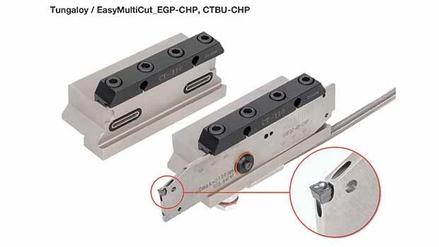 Iwaki, Japan – Tungaloy Corporation officials announce the expansion for EasyMultiCut: the EGP-CHP blade and the CTBU-CHP block, both of which respectively have a coolant hole for high pressure internal coolant supply.