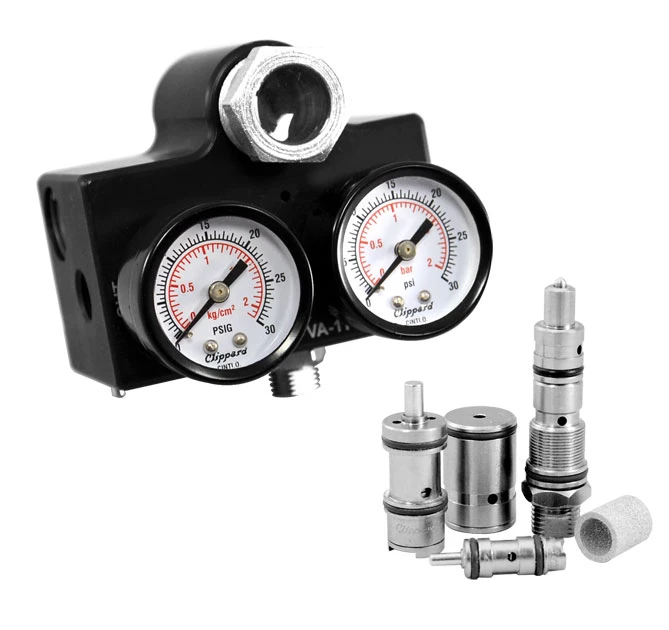 The specially-designed block manifold houses an MPS-2 sensor, three cartridge valves, two pressure gages, and a stainless steel micron filter. In addition, a sight glass is attached to the block that allows for easy inspection of the set point.