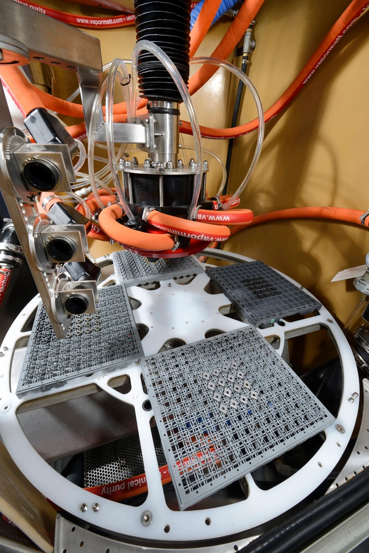 Because it carries an option to fit both Y and X axis nozzle arrangements, the Sabre offers not just customization opportunities but also hybrid functionality. In this one unit, round shank tools, ranging from 3mm to 30mm (0.118” to 1.81”) diameter and 46mm to 307mm (1.85” to 12.08”) in length, can be processed but so too can cutting inserts and the Sabre can hold up to 4 Wendt or 3 Manz trays at a time. With a footprint of just 3.28m² (35.3ft²), the Vapormatt Sabre saves space too.